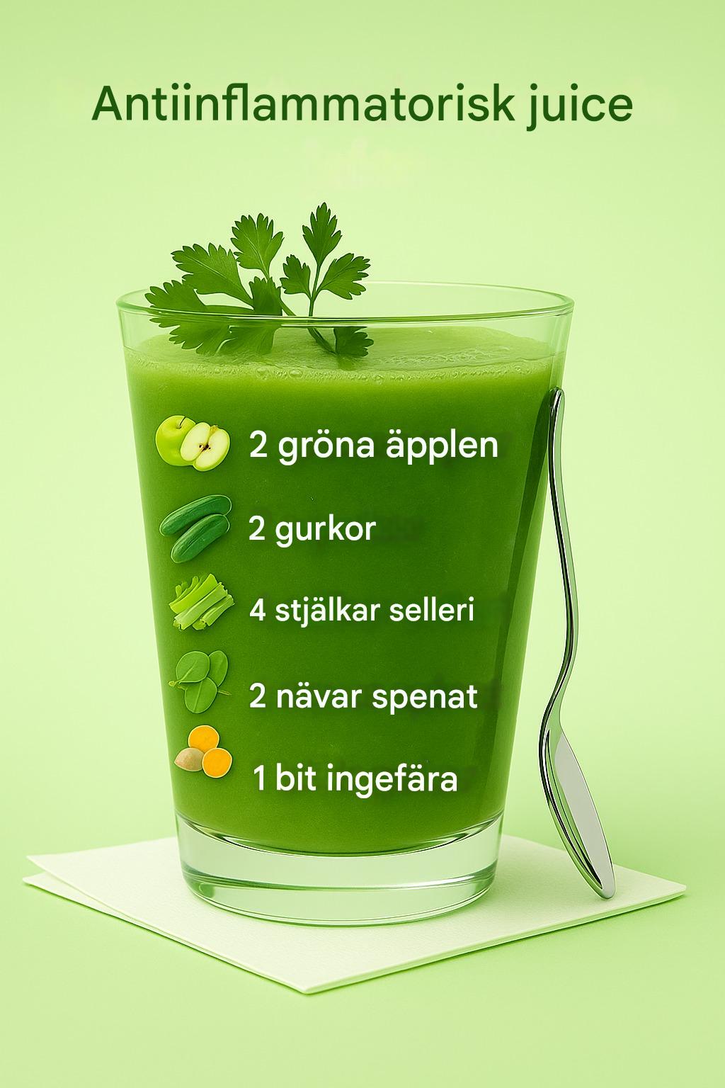antiinflammatorisk  juice Denna juice är fullpackad med  vitaminer, antioxidanter och naturliga antiinflammatoriska ingredienser som stödjer ditt immunförsvar och minskar inflammation i kroppen. Ingredienser: 2 gröna äpplen (Granny Smith fungerar utmärkt – de tillför syra och fibrer) 2 gurkor (återfuktande och kylande för kroppen) 4 stjälkar selleri (rik på antioxidanter och bra för matsmältningen) fortsättning på nästa sida